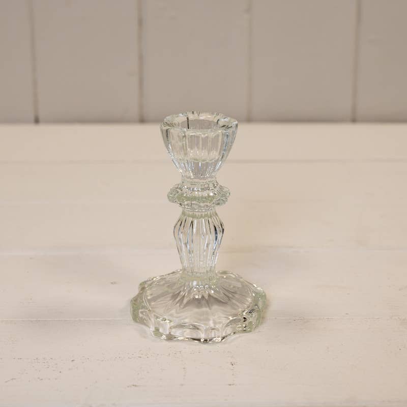 Clear glass candle stick holder, making an elegant addition to your table decor.